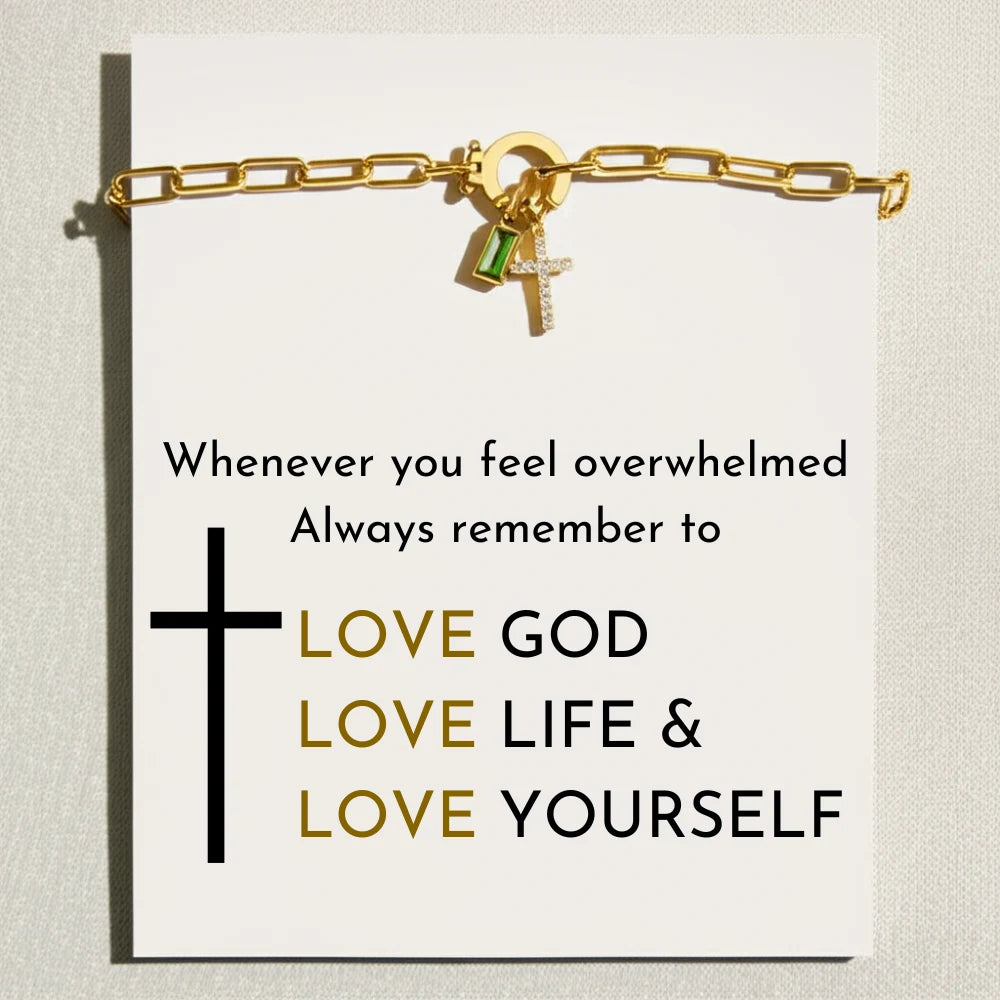 This beautifully crafted paperclip chain bracelet features two timeless charms: a sparkling cross for faith and a personalized birthstone for identity and light. Together, they carry a quiet message of strength, clarity, and self-love. Crafted with care and meaning, it makes the perfect gift for someone in need of encouragement or a personal keepsake to carry inspiration wherever you go.